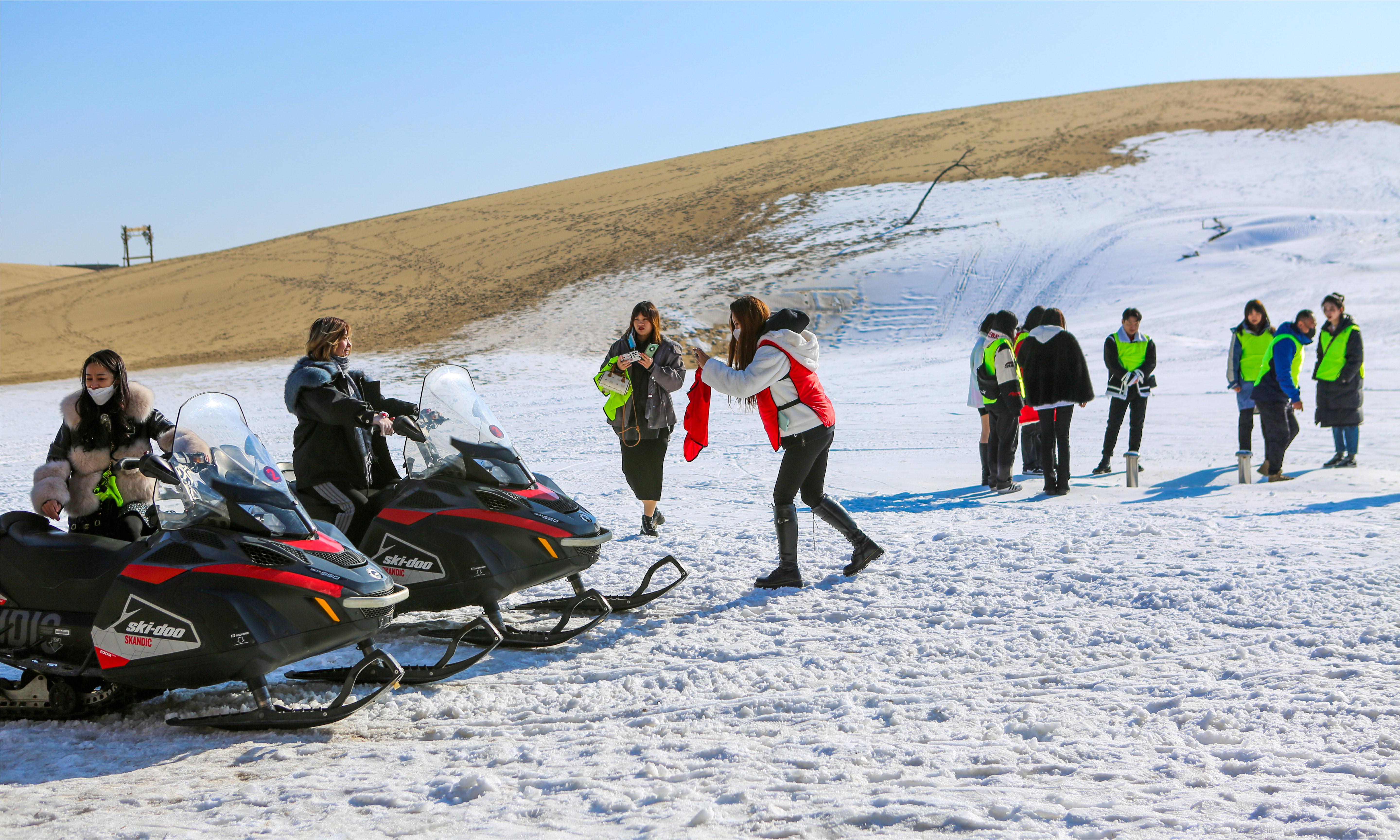 景区开设了不少冰雪项目,游客可以骑着骆驼赏金沙嵌白雪的独特美景,亦可以骑着风驰电掣的雪地摩托感受动力十足的马达轰鸣,还可以拿着雪圈,徜徉在雪场里,解锁更多的雪地玩法。