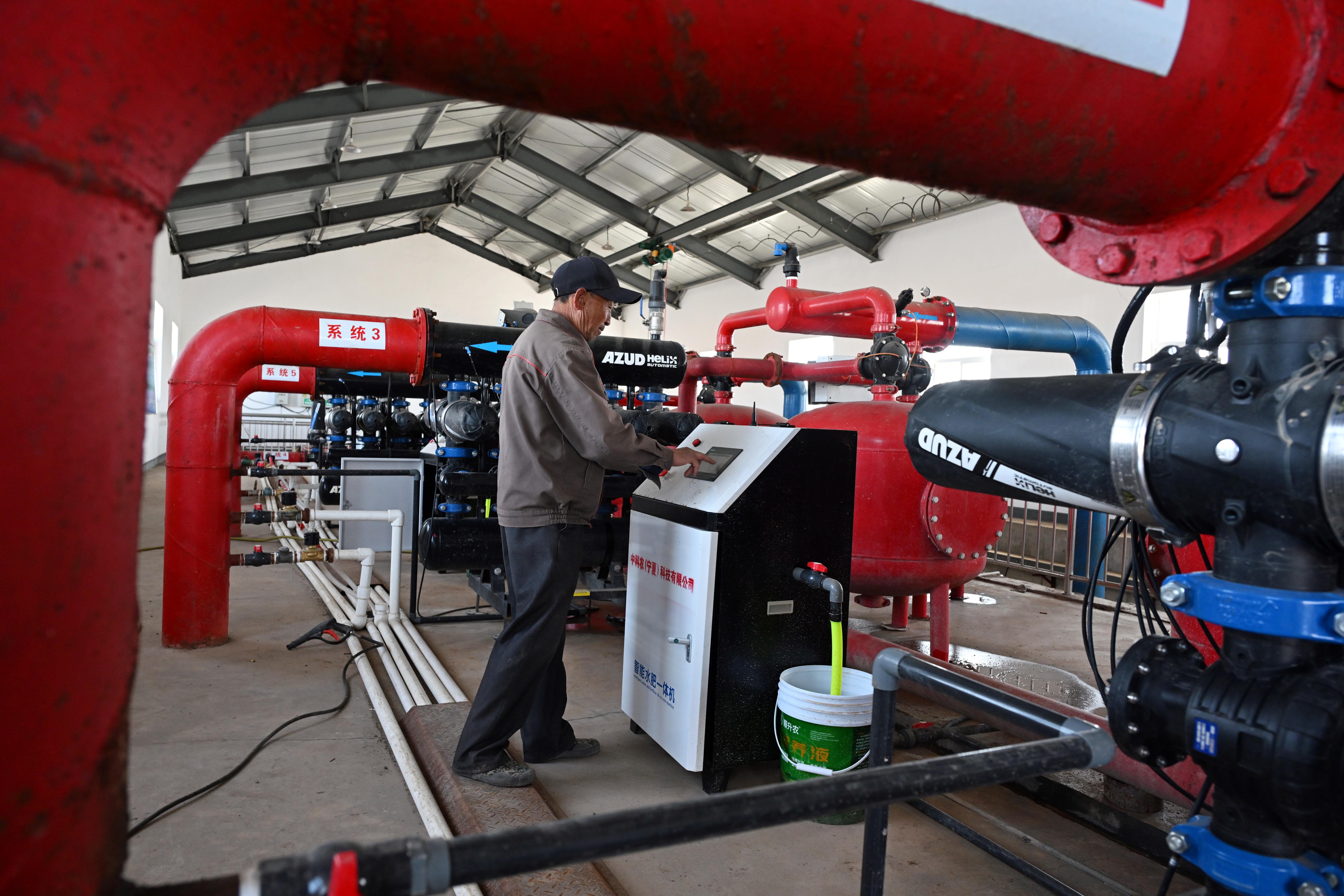 宁夏农垦前进农场高效节水B区泵站,工作人员在检查供水情况。