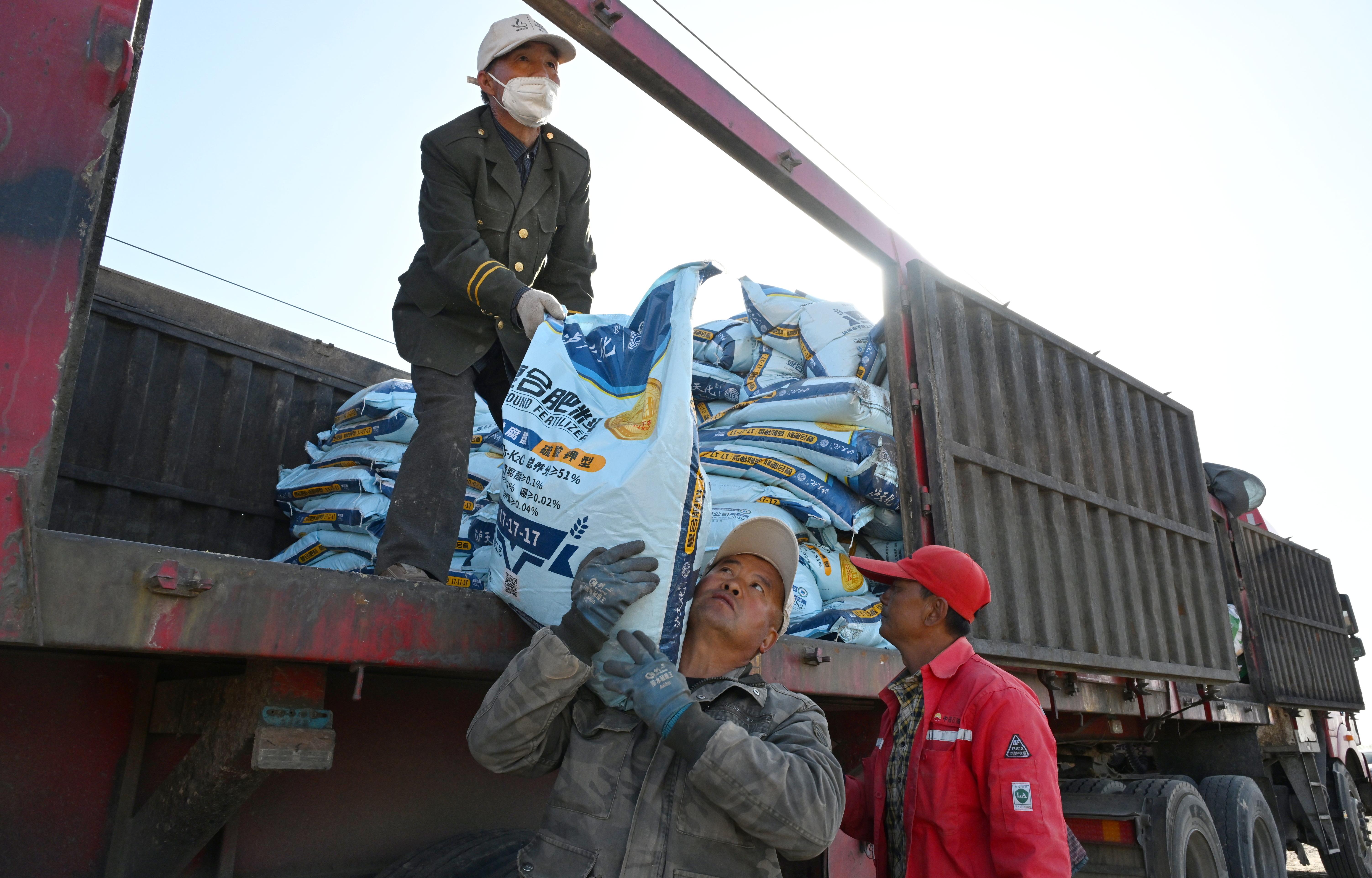工作人员正从车上搬运春耕所需的复合肥料。