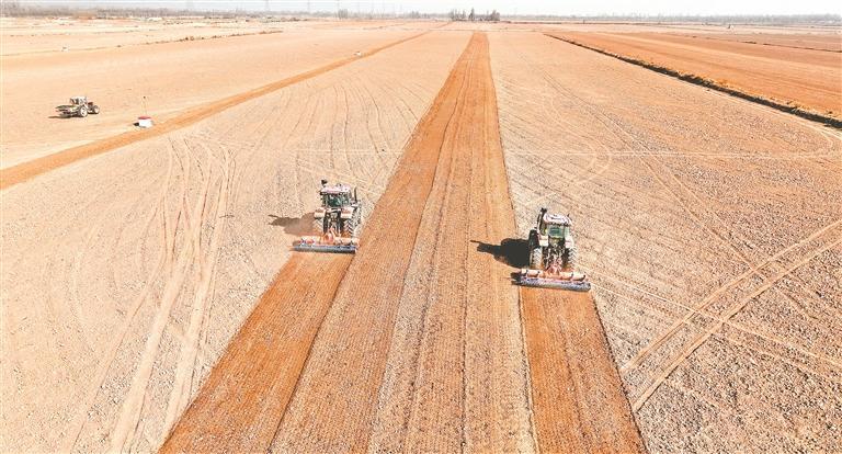 农场内大型机械进行精细化平整作业。